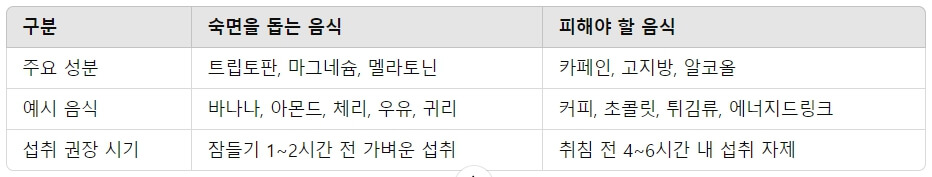 아래는 숙면을 돕는 음식과 피해야 할 식품을 정리한 표입니다: