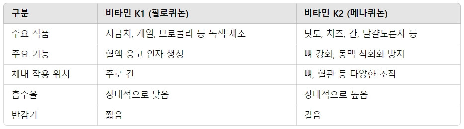 아래 표는 비타민 K1과 K2의 주요 차이점을 정리한 내용입니다: